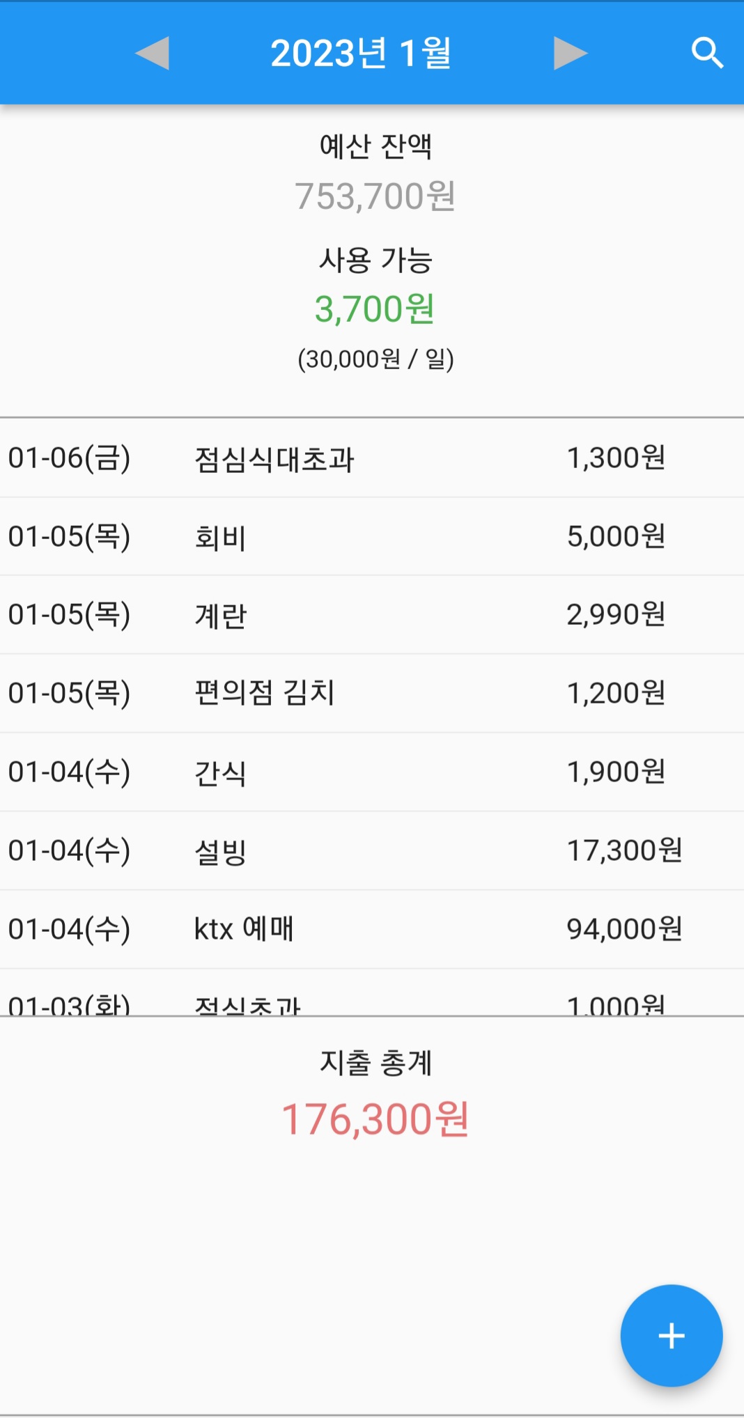 2023년 1월 6일자 화면이고 한 달 예산은 930,000원 1월은 총 31일이므로 매일 30,000원씩 사용 가능에 적립이 되어 총 180,000원의 금액에서 총 지출이 176,300원이 발생하여 최종 사용 가능금액은 3,700원만 사용할 수 있네요!
